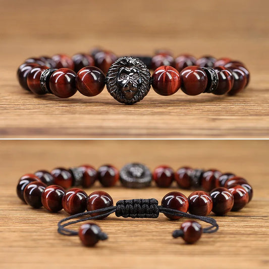 ROYAL LION - bordó tigrit ásvány karkötő oroszlán fejjel – állítható méretű férfi ékszer